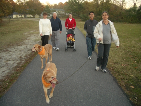 shower. Here we all are out for a walk around the lake. My Aunt Sabrina and Uncle Gil are there to the right walking Cesar and Cleo, and my Oma and Abuelo are to the left. I liked the doggies, and they liked giving me kisses (freaking my mommy out a little bit). |